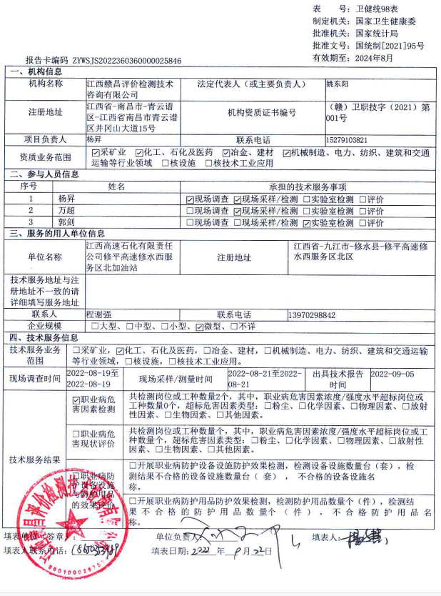 上一篇:江西高速石化有限責(zé)任公司武吉高速修水服務(wù)區(qū)東加油站工作場所職業(yè)病危害因素檢測報(bào)告