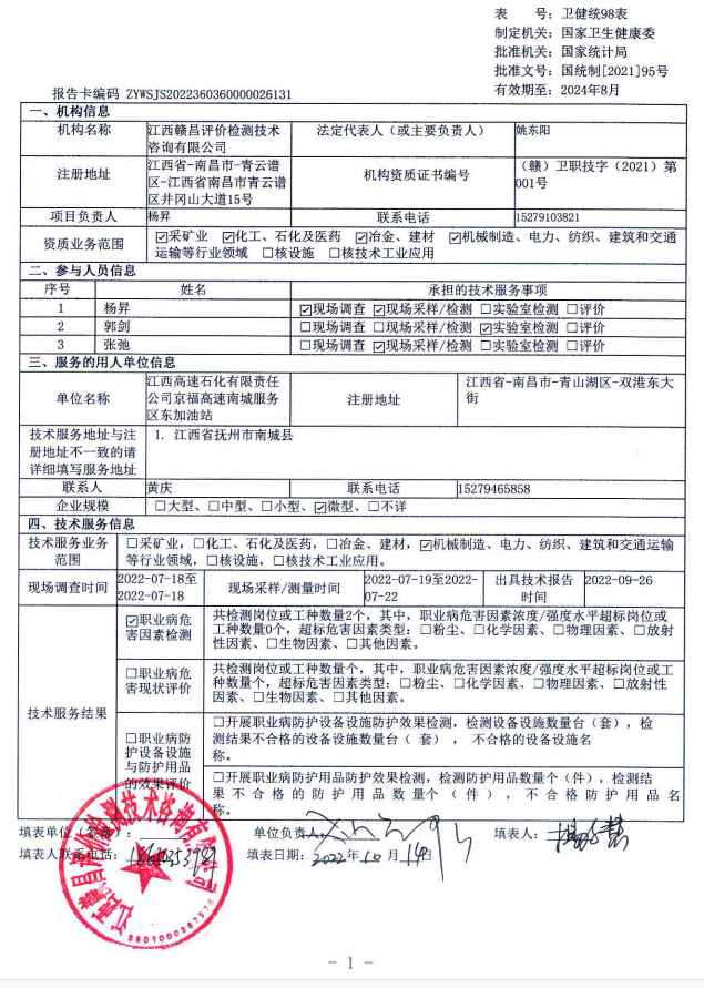 下一篇:江西高速石化有限責(zé)任公司京福高速南城服務(wù)區(qū)西加油站工作場所職業(yè)病危害因素檢測報告