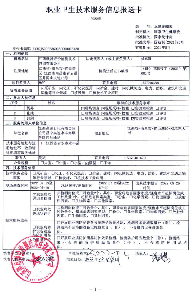 上一篇:江西高速石化有限責(zé)任公司昌寧高速永豐南服務(wù)區(qū)東加油站工作場(chǎng)所職業(yè)病危害因素檢測(cè)報(bào)告