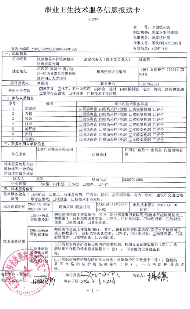 江西廣宥鞋業(yè)有限公司工作場所職業(yè)病危害因素檢測報告