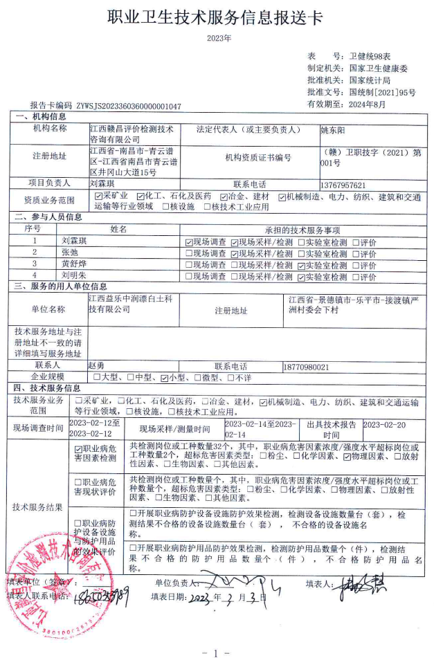 江西益樂中潤漂白土科技有限公司工作場所職業(yè)病危害因素檢測報告