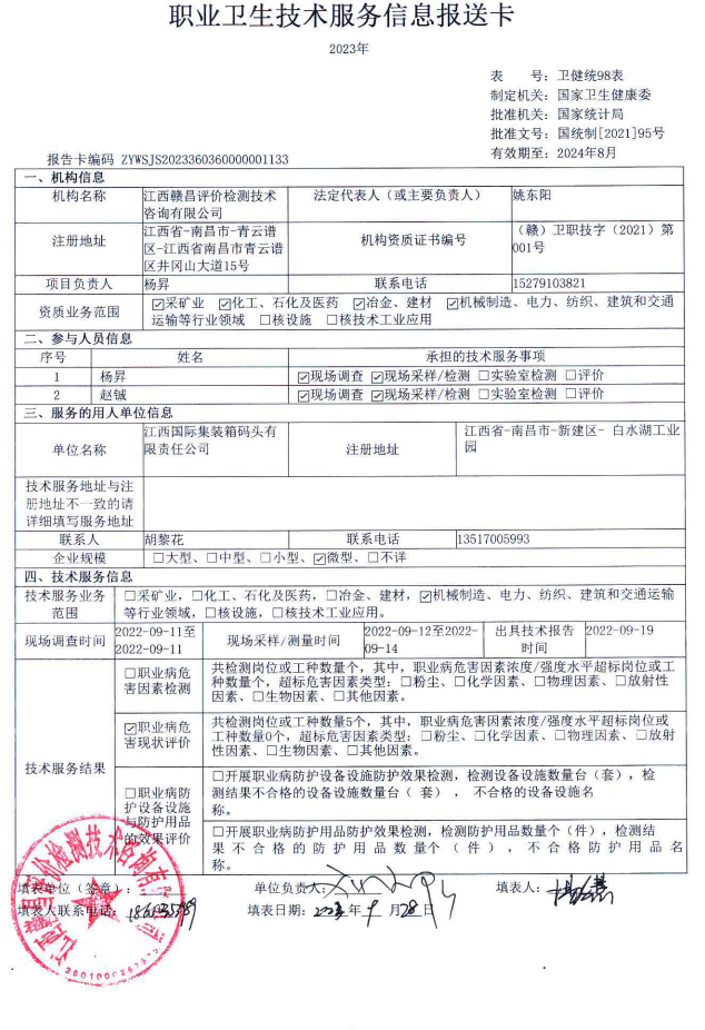 江西國際集裝箱碼頭有限責(zé)任公司工作場所職業(yè)病危害因素檢測報告