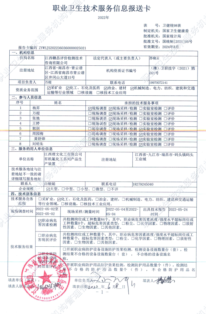 下一篇:江西理文化工有限公司2.5萬噸/年無水氟化氫工作場(chǎng)所職業(yè)病危害因素檢測(cè)報(bào)告