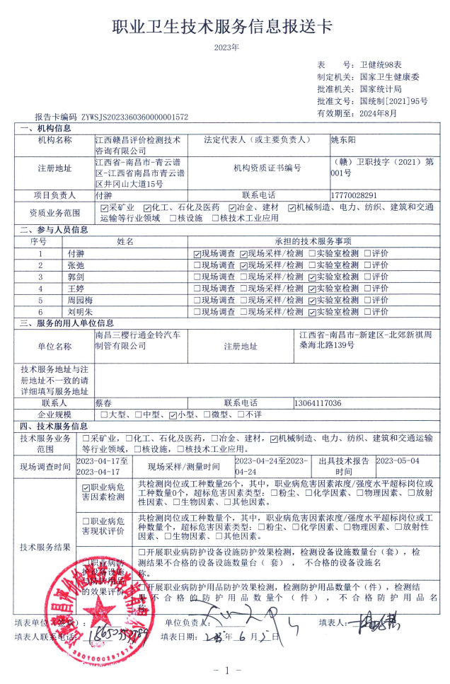 南昌三櫻行通金鈴汽車制管有限公司工作場所職業(yè)病危害因素檢測報(bào)告