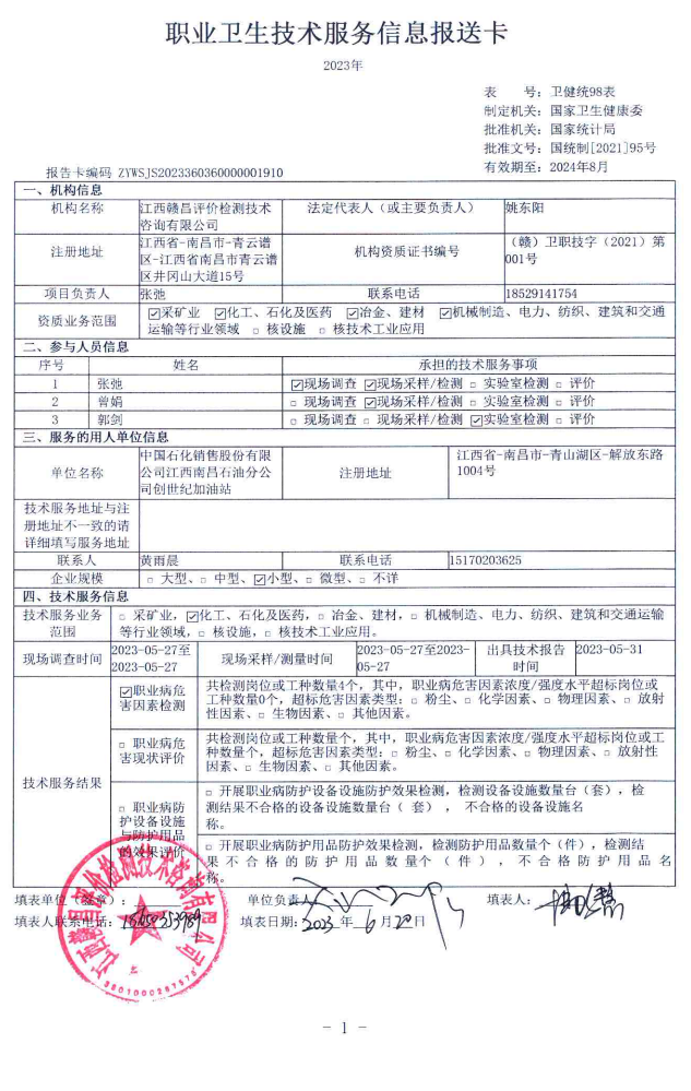 中國石化銷售股份有限公司江西南昌石油分公司創(chuàng)世紀加油站工作場所職業(yè)病危害因素檢測報告