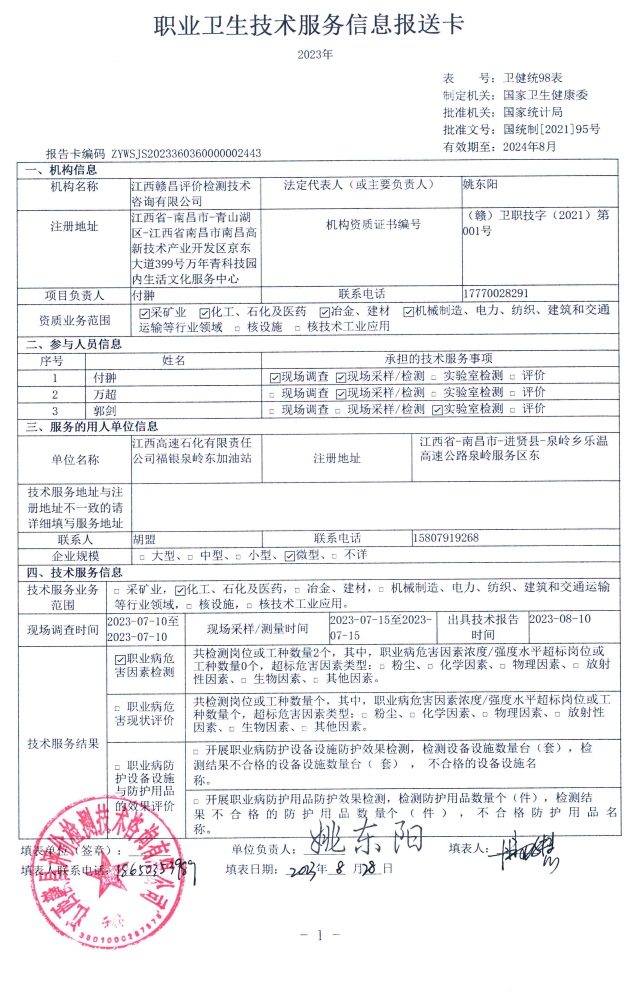 江西高速石化有限責任公司福銀泉嶺西加油站工作場所職業(yè)病危害因素檢測報告