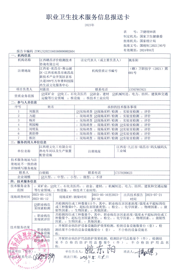 江西理文化工有限公司熱電車間以及生產(chǎn)裝置配套設(shè)施工作場所職業(yè)病危害因素檢測報告