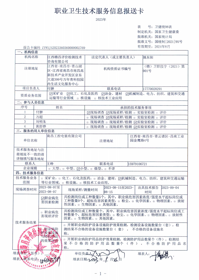 南昌工控電裝有限公司工作場所職業(yè)病危害因素檢測報告