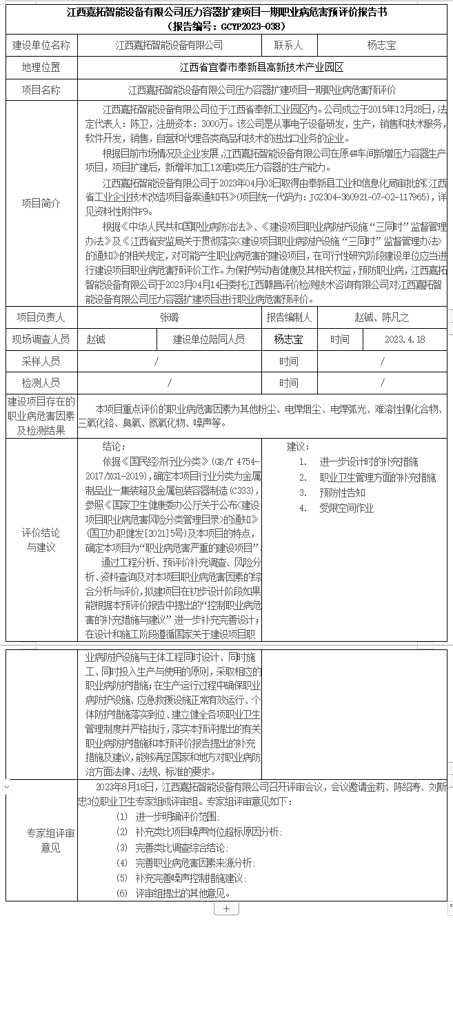 江西嘉拓智能設(shè)備有限公司壓力容器擴建項目一期職業(yè)病危害預(yù)評價報告書 (報告編號:GCYP2023-038)