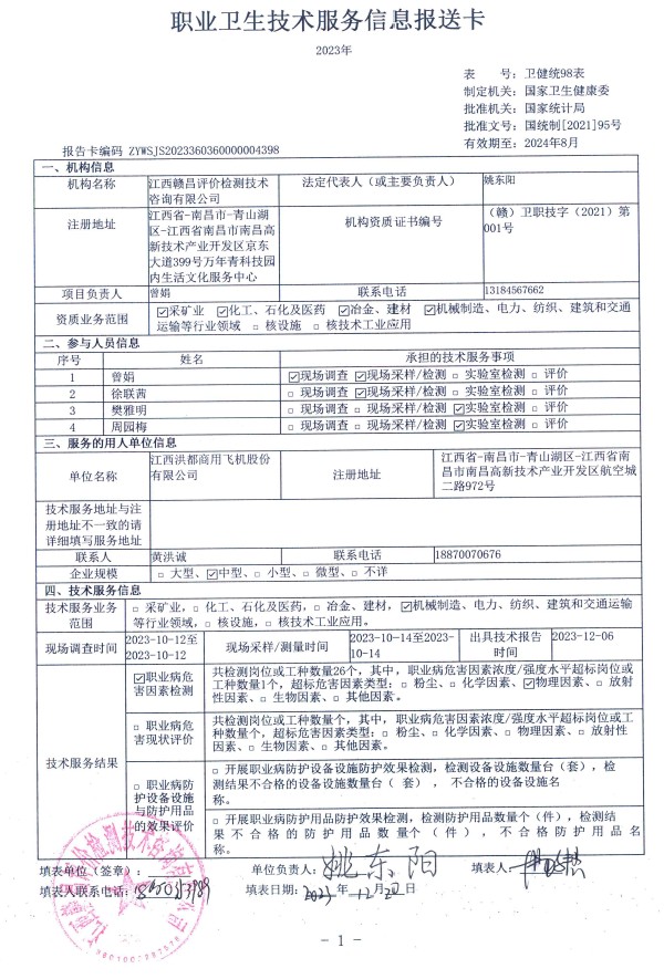 江西洪都商用飛機(jī)股份有限公司大部件廠房工作場所職業(yè)病危害因素檢測報告
