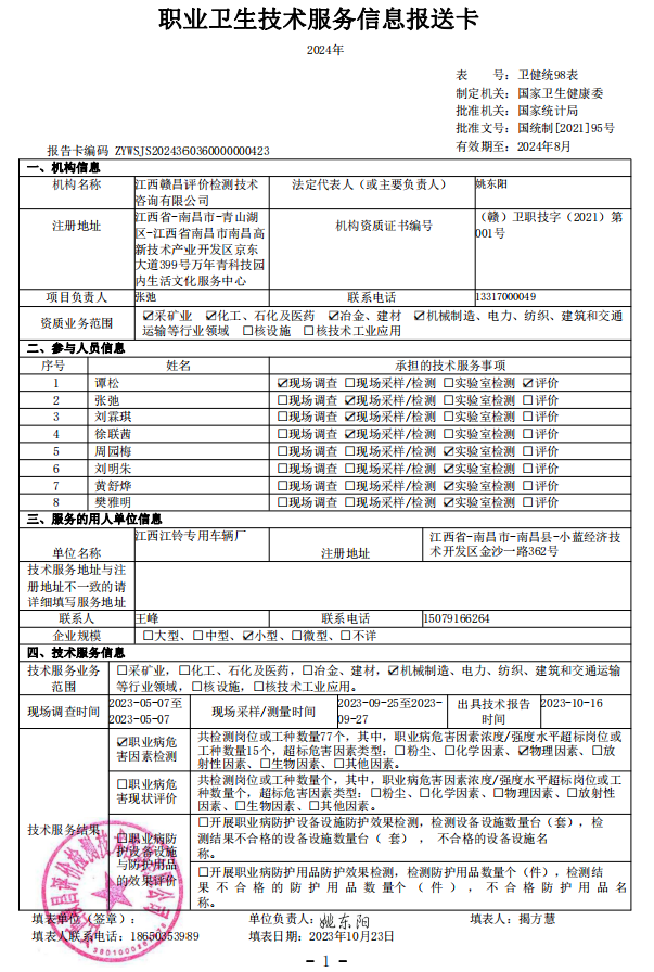 江西江鈴專用車輛廠有限公司工作場所職業(yè)病危害因素檢測報告