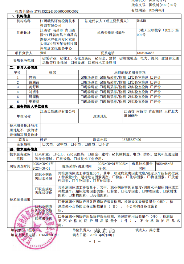 江西美晨通訊有限公司工作場所職業(yè)病危害因素檢測報(bào)告
