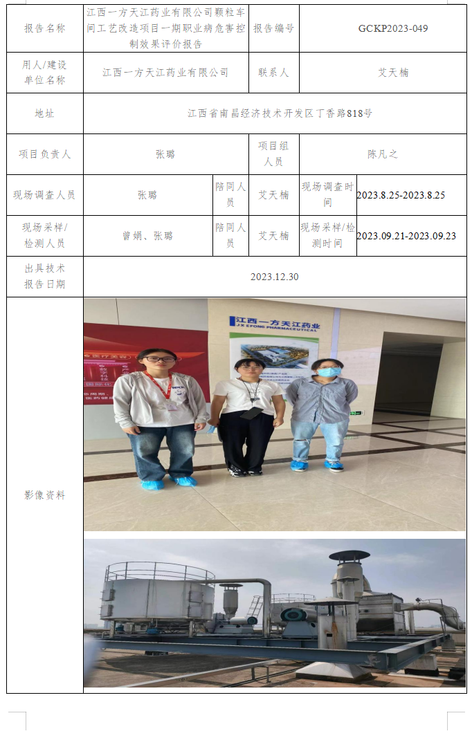 江西一方天江藥業(yè)有限公司顆粒車(chē)間工藝改造項(xiàng)目一期職業(yè)病危害控制效果評(píng)價(jià)報(bào)告