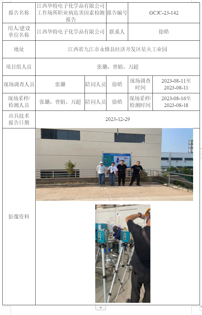 上一篇:江西華特電子化學(xué)品有限公司工作場(chǎng)所職業(yè)病危害因素檢測(cè)報(bào)告