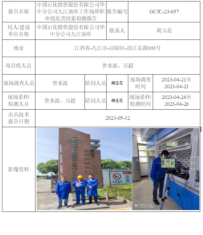 中國石化銷售股份有限公司華中分公司九江油庫工作場所職業(yè)病危害因素檢測報告