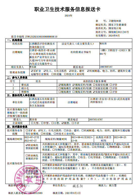 上一篇:江西高速石化有限責任公司武吉高速仙女湖服務區(qū)西加油站工作場所職業(yè)病危害因素檢測報告