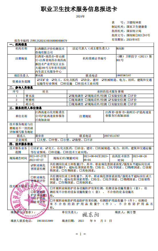 下一篇:江西高速石化有限責(zé)任公司滬昆高速宜春服務(wù)區(qū)北加油站工作場(chǎng)所職業(yè)病危害因素檢測(cè)報(bào)告