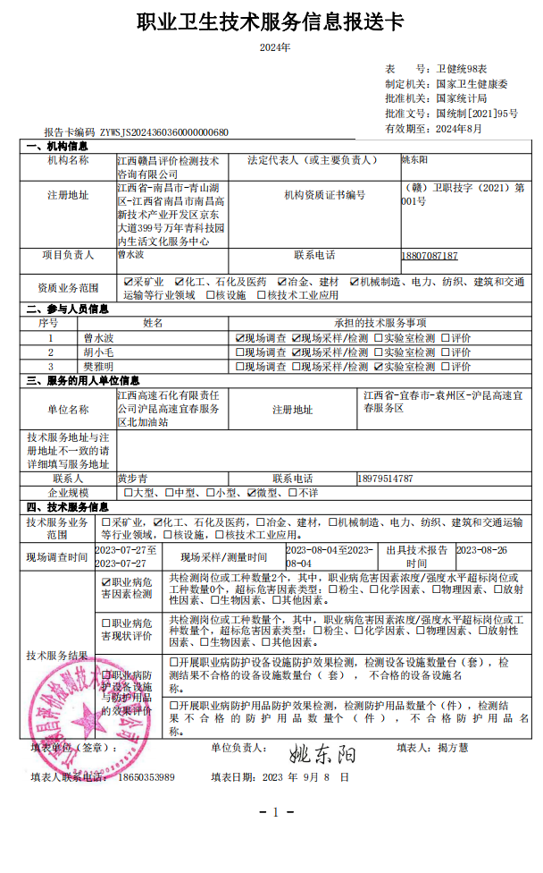 下一篇:江西高速石化有限責(zé)任公司滬昆高速萍鄉(xiāng)服務(wù)區(qū)南加油站工作場(chǎng)所職業(yè)病危害因素檢測(cè)報(bào)告