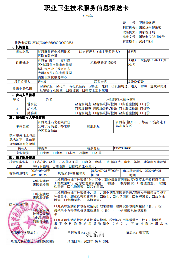 上一篇:江西高速石化有限責(zé)任公司瑞贛高速于都服務(wù)區(qū)南加油站工作場所職業(yè)病危害因素檢測報告