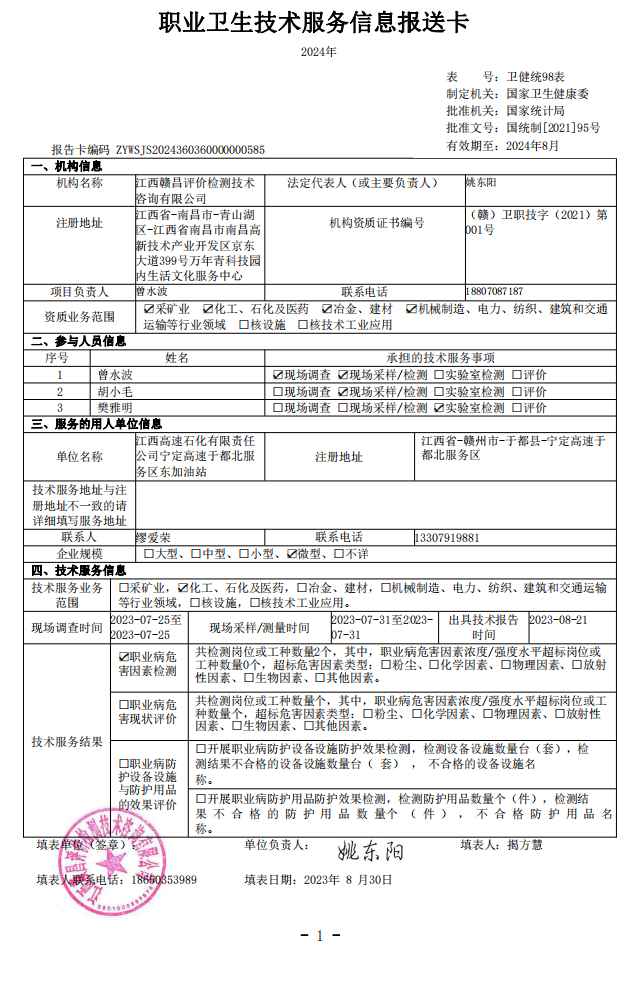 下一篇:《江西高速石化有限責(zé)任公司泉南高速興國(guó)服務(wù)區(qū)北加油站工作場(chǎng)所職業(yè)病危害因素檢測(cè)報(bào)告》(報(bào)告編號(hào):GCJC-23-121-19)