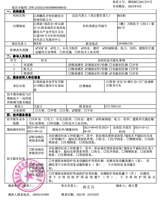 下一篇:《江西高速實(shí)業(yè)開發(fā)有限公司峽江服務(wù)區(qū)西加油站工作場所職業(yè)病危害因素檢測報告》(報告編號:GCJC-23-152-20)