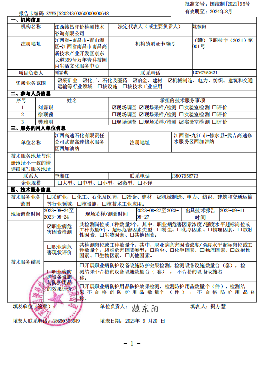 下一篇:江西高速石化有限責(zé)任公司修平高速修水西服務(wù)區(qū)北加油站工作場所職業(yè)病危害因素檢測報(bào)告》(報(bào)告編號(hào):GCJC-23-144-19)