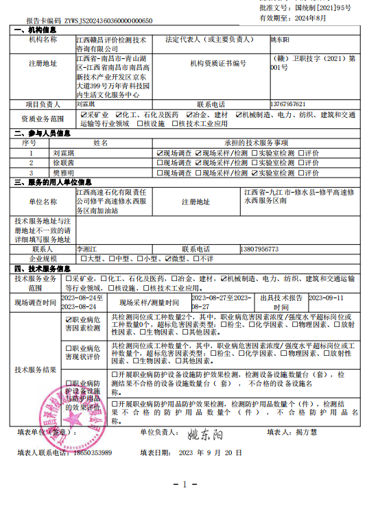 上一篇:江西高速石化有限責(zé)任公司修平高速修水西服務(wù)區(qū)北加油站工作場(chǎng)所職業(yè)病危害因素檢測(cè)報(bào)告》(報(bào)告編號(hào):GCJC-23-144-19)