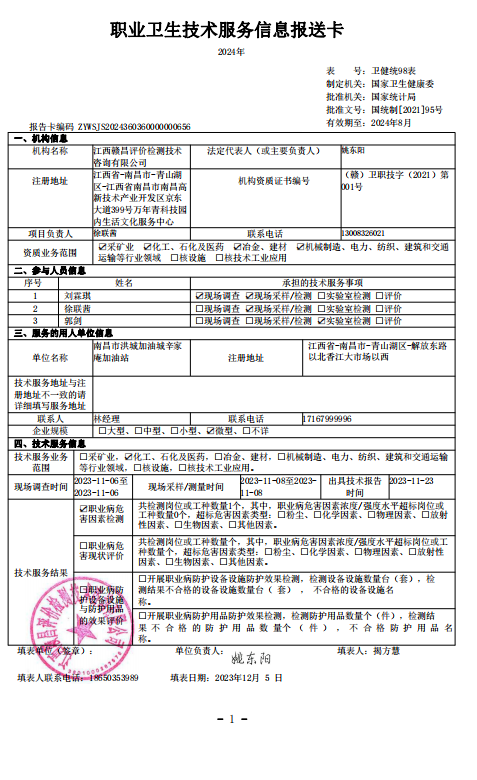 下一篇:《南昌市洪城加油站工作場(chǎng)所職業(yè)病危害因素檢測(cè)報(bào)告》(報(bào)告編號(hào):GCJC-23-271-2)