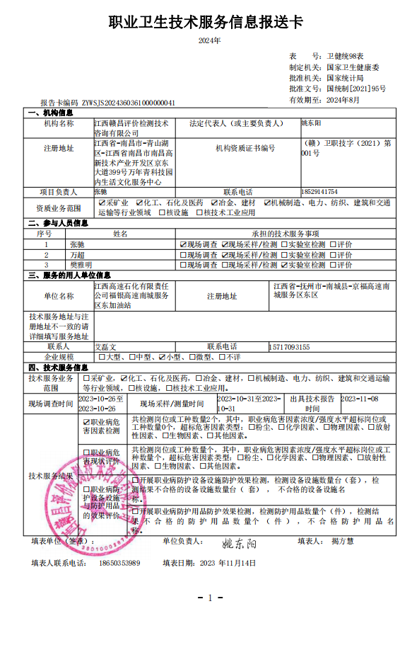 下一篇:《江西高速石化有限責任公司福銀高速南城服務(wù)區(qū)西加油站》工作場所職業(yè)病危害因素檢測報告》(報告編號:GCJC-23-141-18)