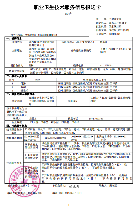 下一篇:《江西高速實(shí)業(yè)開(kāi)發(fā)有限公司彭澤服務(wù)區(qū)北加油站工作場(chǎng)所職業(yè)病危害因素檢測(cè)報(bào)告》(報(bào)告編號(hào):GCJC-23-152-14)