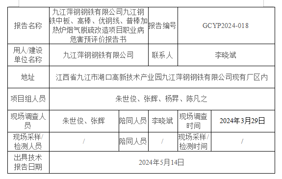 下一篇:九江萍鋼鋼鐵有限公司九江鋼鐵煉鐵廠2號(hào)3號(hào)4號(hào)高爐熱風(fēng)爐煙氣脫硫項(xiàng)目職業(yè)病危害預(yù)評(píng)價(jià)報(bào)告書(shū)GCYP2024-015