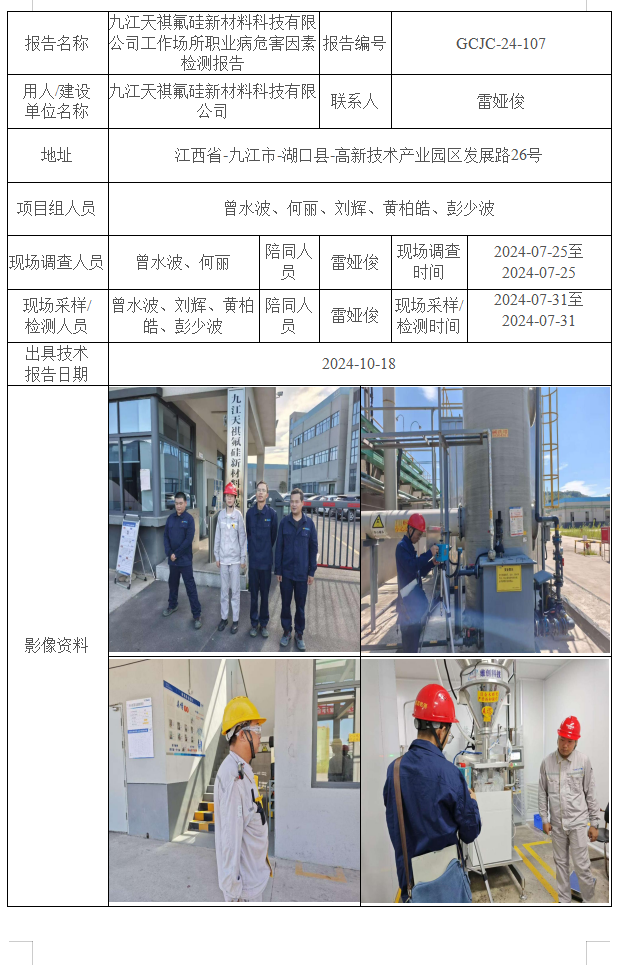 九江天祺氟硅新材料科技有限公司工作場所職業(yè)病危害因素檢測報告
