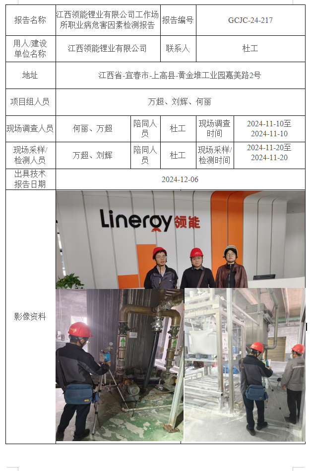 江西領(lǐng)能鋰業(yè)有限公司工作場所職業(yè)病危害因素檢測報告