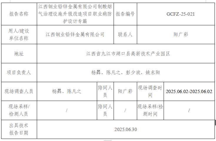 江西銅業(yè)鉛鋅金屬有限公司制酸煙氣治理設(shè)施升級改造項目職業(yè)病危害預評價報告書