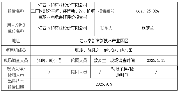 江西同和藥業(yè)股份有限公司 二廠區(qū)部分車(chē)間、裝置新、改、擴(kuò)項(xiàng)目職業(yè)病危害預(yù)評(píng)價(jià)報(bào)告書(shū)