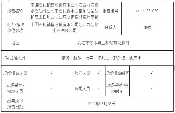 中國石化銷售股份有限公司江西九江修水石油分公司中石化修水三都加油站改擴建工程項目職業(yè)病防護設(shè)施設(shè)計專篇