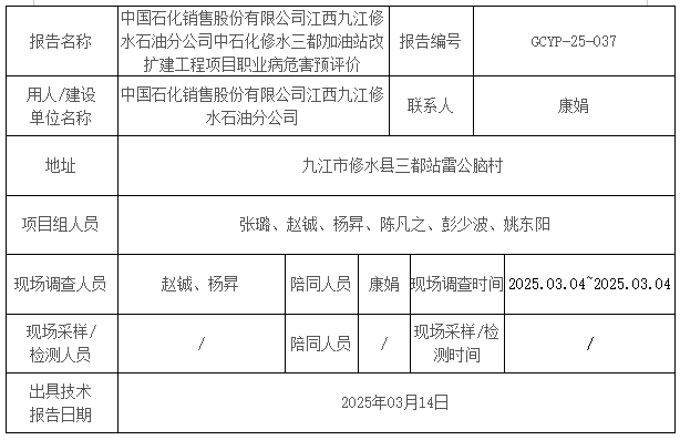 中國石化銷售股份有限公司江西九江修水石油分公司中石化修水三都加油站改擴建工程項目職業(yè)病危害預評價