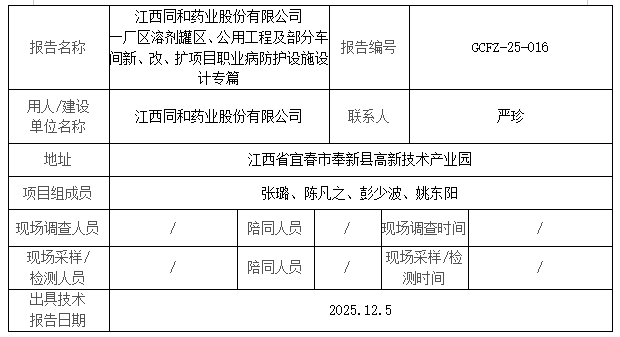 江西同和藥業(yè)股份有限公司 一廠區(qū)溶劑罐區(qū)、公用工程及部分車間新、改、擴項目職業(yè)病防護設施設計專篇