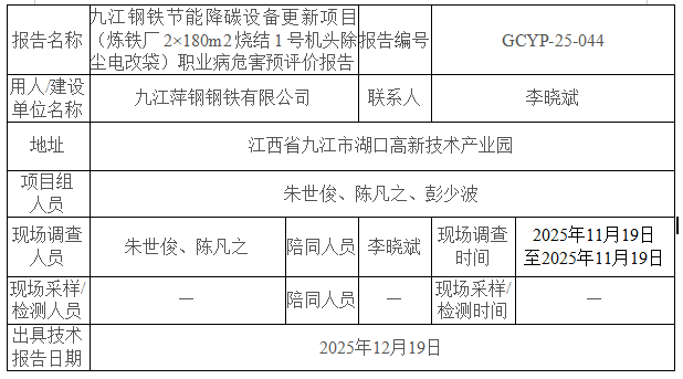 九江鋼鐵節(jié)能降碳設(shè)備更新項(xiàng)目(煉鐵廠2×180m2燒結(jié)1號(hào)機(jī)頭除塵電改袋)職業(yè)病危害預(yù)評(píng)價(jià)報(bào)告