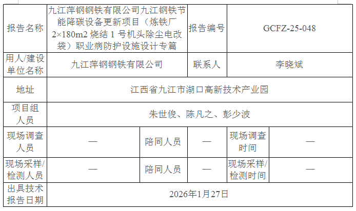 九江萍鋼鋼鐵有限公司九江鋼鐵節(jié)能降碳設(shè)備更新項目(煉鐵廠2×180m2燒結(jié)1號機頭除塵電改袋)職業(yè)病防護設(shè)施設(shè)計專篇