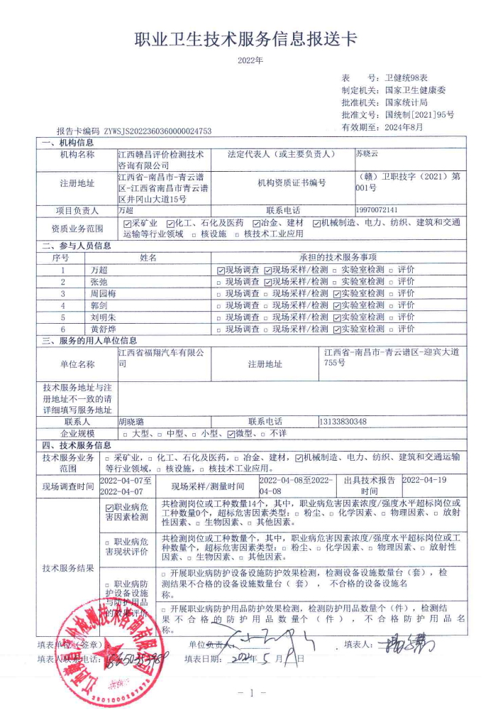 江西省福翔汽車有限公司工作場(chǎng)所職業(yè)病危害因素檢測(cè)報(bào)告